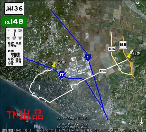 在上篇,屏136的沿海路段已經介紹完畢,線在就來介紹下篇直線衝刺的快感,屏136在過了7k之後一直到終點幾乎都是直線雙向道的規模,而本段也被選為水底寮塞車時往恆春地區的替代道路,在過了太原村之後就有點美國荒園中的公路之感,兩旁盡是一望無際的農田,其實在最早是蔗田,但南州糖廠停止製糖後,台糖公司便成了包租公,大片土地租給農民種植作物,現在就由上篇東海派出所前繼續紀錄吧